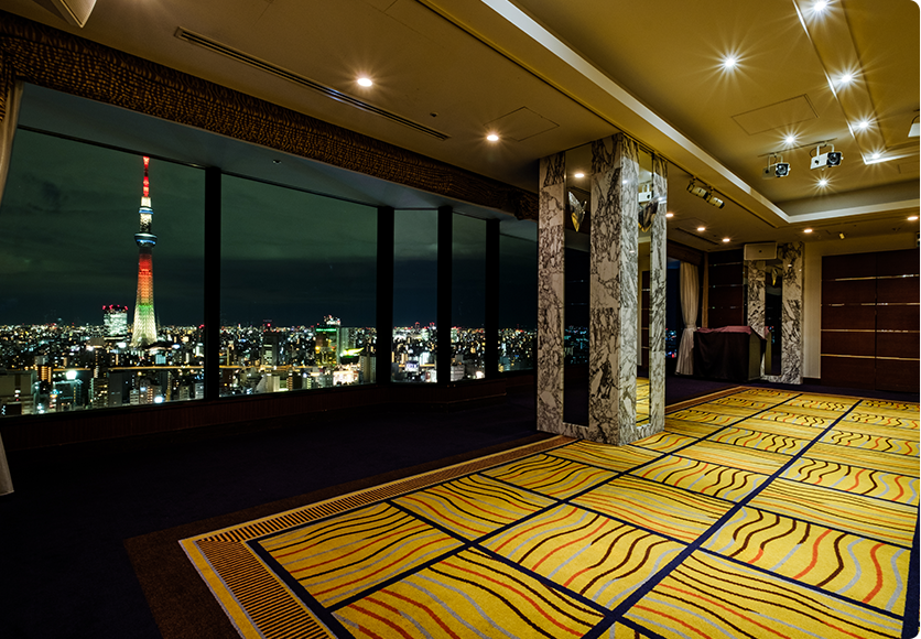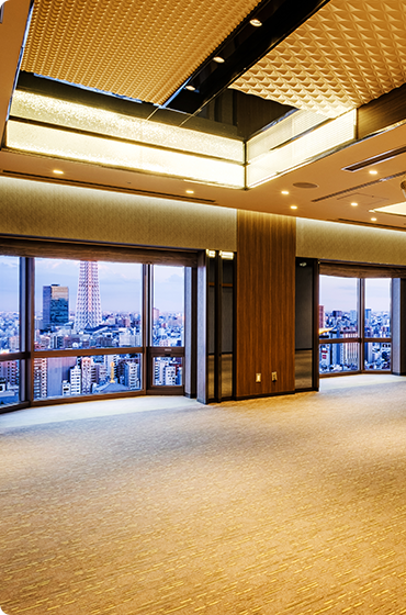 浅草ビューホテルで最大の規模と華やかさを誇るメインバンケット。ゆとりある天井、華やかにきらめく照明、そして輝きを放つシャンデリア。そのすべてがご宴会の雰囲気をいっそう盛り上げます。